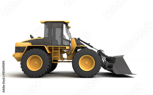 © Evgenii Iakovenko, Fototapeta premium Powerfull concept. Massive yellow hydraulic earth mover isolated on white. Left to right direction. 3D illustration. Right view
