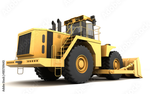 © Evgenii Iakovenko, Fototapeta premium Powerfull concept. Massive yellow hydraulic earth mover isolated on white. Left to right direction. 3D illustration. Wide angle. Rear view