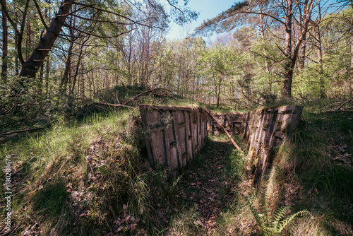Obraz premium Pozostałości okopów z czasów wojenncyh w lesie