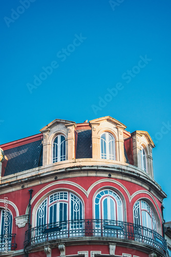 © GFocus, Obraz premium Prédio antigo vermelho com janelas arqueadas sob céu azul.