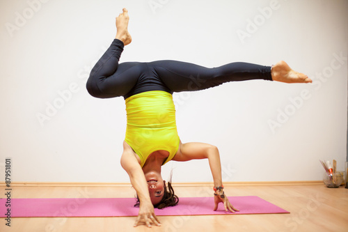 © AntonioDiaz, Naklejka premium Practicing a headstand with a leg split