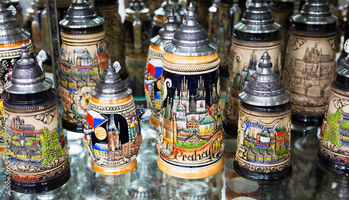 Obraz premium Praga, Czechy, pamiątkowy czeski kufel do piwa. Kufle przedstawiające...