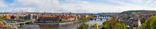 © Mykola Iegorov, Fototapeta premium PRAGA, REPUBLIKA CZESKA - KWIECIEŃ, 30, 2017: Wiosenny panoramiczny widok na miasto z Letenske garedn. Stare i nowoczesne budynki i mosty na Wełtawie.
