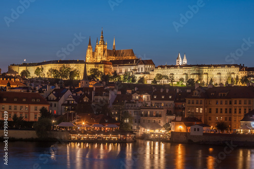 Fototapeta premium Prague Castle and Charles Bridge in the evening, Prague, Czech Republic, Vltava river in foreground.