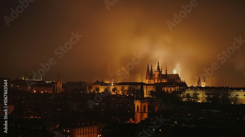 © Ahmad-Muslimin, Fototapeta premium Prague Castle and Fireworks Display Over the City at Night
