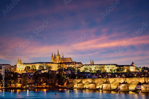 © Delphotostock, Fototapeta premium Prague castle and the Charles bridge at night, Czech republic