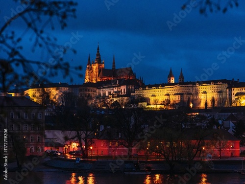 © Wirestock, Obraz premium Prague Castle illuminated at night with reflections on the Vltava River.