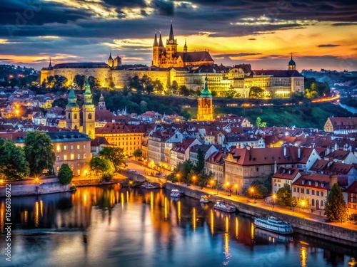 © Man888, Fototapeta premium Prague Castle Night View: Majestic Panorama of Illuminated Cityscape