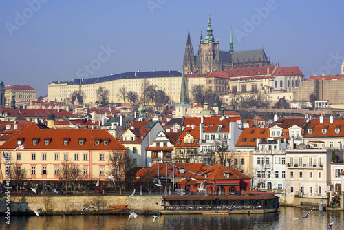 © Tanya, Fototapeta premium Prague Castle overlooks the city with seagulls flying above the river