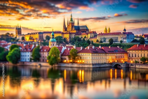 © Sirinporn, Naklejka premium Prague Castle Sunset Tilt-Shift - Vltava River Panorama