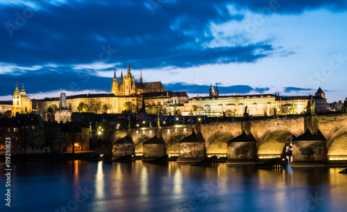Fototapeta premium Prague Castle with charle's bridge in twilight with dramatic sky