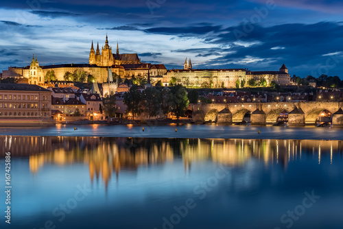 Obraz premium Prague Castle with cloudy sunset blue sky and Charles Bridge light up