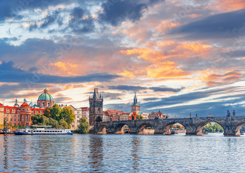 Fototapeta premium Prague - Charles bridge, Czech Republic. Scenic aerial sunset on the architecture of the Old Town Pier and Charles Bridge over the Vltava River in Prague, Czech Republic.