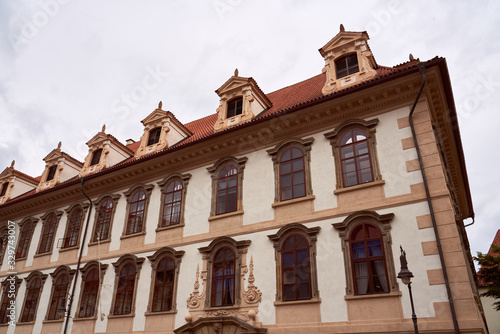 Obraz premium Prague cityscape with historic cityscape and the Prague castle. Horizontal photo of colorful European city of Prague in Czech Republic daytime, cloudy sky, month of may, travel in tourist place.