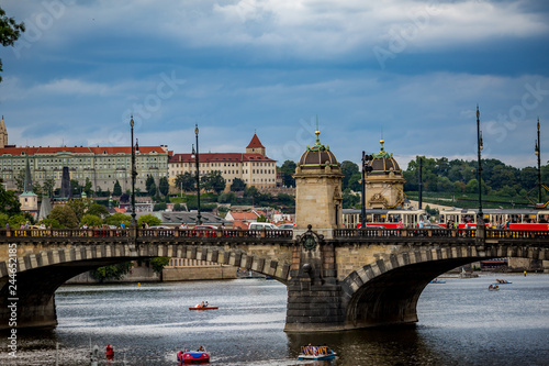 © lightcaptured, Fototapeta premium PRAGUE, CZECH REPUBLIC - AUGUST 28, 2015: Pedal boats sail and pass under the medieval stone Chec Bridge on Vltava River, Prague, Czech Republic in calm summer evening with people walking on top