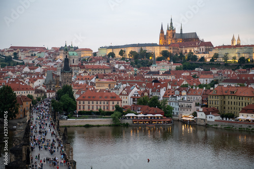Fototapeta premium Prague, Czech Republic. Charles Bridge and Hradcany (Prague Castle) with St. Vitus Cathedral and St. George church evening dusk, Bohemia landmark in Praha.