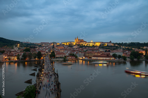 © Markos Loizou, Naklejka premium Prague, Czech Republic. Charles Bridge and Hradcany (Prague Castle) with St. Vitus Cathedral and St. George church evening dusk, Bohemia landmark in Praha.
