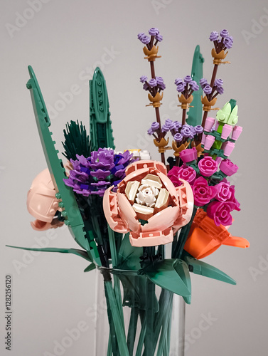 Naklejka premium Prague, Czech republic - February 20, 2025: Colorful lego flower bouquet in...