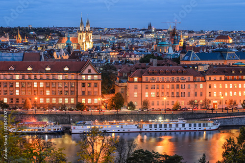 © esvetleishaya, Fototapeta premium Prague, Czech Republic - October 6, 2017: Beautiful evening roof view on Tyn Church, Vltava river and Old Town Square, Prague, Czech Republic. The Church of Our Lady Before Tyn.