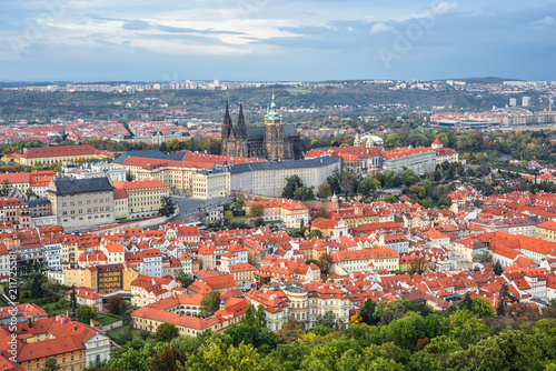 © esvetleishaya, Fototapeta premium Prague, Czech Republic - October 7, 2017: View on Saint Vitus Cathedral and the roofs of Prague Castle. St. Cityscape of Prague, Czech Republic.