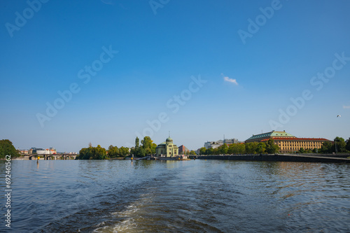 © WSPHOTO, Fototapeta premium Prague, Czech Republic - September 26, 2023 - View of Charles Bridge, Old Town, Vltava River during a boat trip in Prague.