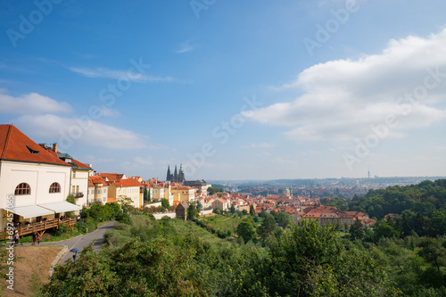 Fototapeta premium Prague, Czech Republic - September 26, 2023 - View of the Prague skyline while climbing Petrin Tower.