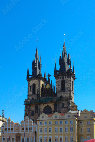 Fototapeta premium Prague Main square, Church of Our Lady before Tyn. Blue sky. Copy space