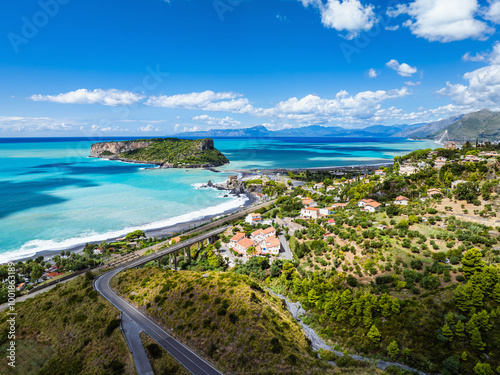 Naklejka premium Praia a Mare from a drone, Tyrrhenian Sea, Cosenza, Calabria, Italy, Europe
