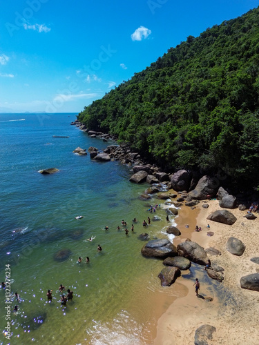 © Lucas Monteiro, Obraz premium Praia do Cedro, in Ubatuba, Brazil, offers an untouched tropical haven with crystal-clear waters and golden sands nestled between lush green hills. The rocky shoreline enhances the charm.