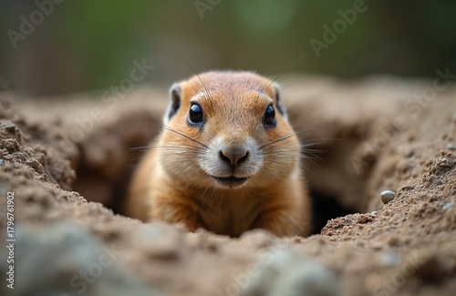 © Vadym, Fototapeta premium Prairie dog peers from burrow. Cute rodent observes. Furry animal with curious eyes. Wildlife portrait in natural habitat. Brown creature looking at camera.
