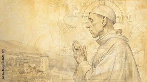 © T Studio, Fototapeta premium Prayer of St. Wilfrid at 7th-Century English Monastery, Biblical Illustration, Beige Background, Copyspace