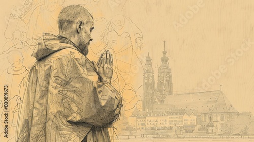 Fototapeta premium Prayer of St. Wolfgang of Regensburg at 10th-Century German Church, Biblical Illustration, Beige Background, Copyspace