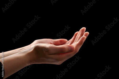 Fototapeta premium Praying Hands with White Embroidered Robe Against Dark Background