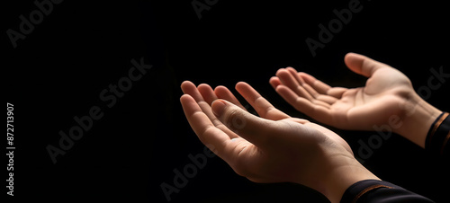 Fototapeta premium Praying Hands with White Embroidered Robe Against Dark Background