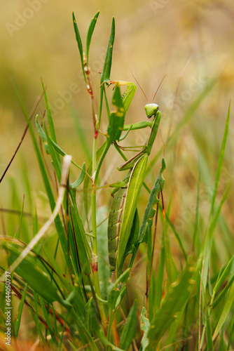 Fototapeta premium Praying mantis - a predator that lives in grasslands. Photo of a praying mantis in the tall grass.