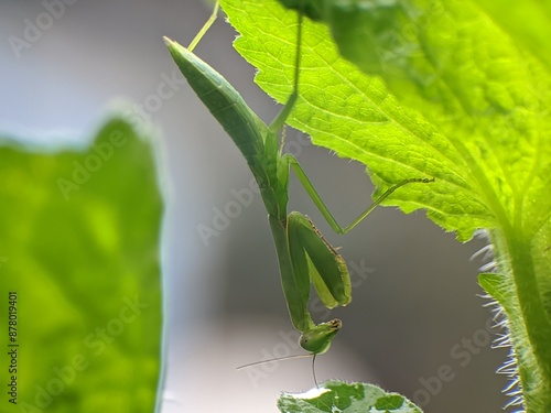 © RMX IMG, Naklejka premium praying mantis under ageratum conyzoides leaves with blur background