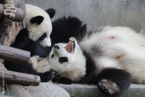 © foreverhappy, Fototapeta premium Precioud Moent of Love, Mother Panda and her Cub, Little cub is trying to wake up her mom, Chengdu, China