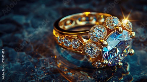 Fototapeta premium Precious glowing golden ring wtih big diamond or adamant on dark rocky...