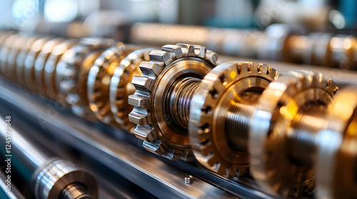 © Moddy, Obraz premium Precision Engineering: Close-up of intricate gears and metal components in a complex machinery system, showcasing precision engineering and industrial technology.