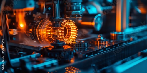 © MdNazim, Obraz premium Precision Engineering: Close-Up of Intricate Industrial Machine with Blue and Orange Lighting