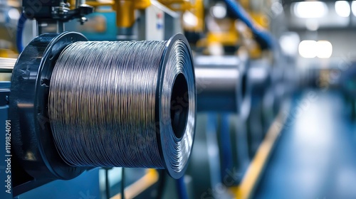 Obraz premium Precision Engineering - Close-up of Shiny Metallic Wire Spools in Clean Factory Setting