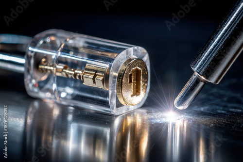 Naklejka premium Precision engineering of a transparent padlock with a shiny key and metallic...
