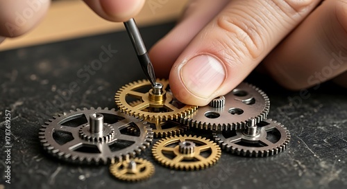© Barokah, Fototapeta premium Precision in motion: Watchmaker meticulously assembling intricate clockwork gears mechanism with expert hands using
