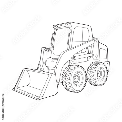 © Sopian, Naklejka premium Precision Line Art of a Skid Steer Loader Ready for Construction and Heavy Lifting Projects, Perfect for Technical Drawings and Industrial Design, Editable Format for Versatile Use