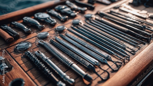 Naklejka premium Precision-styled fishing setup with each net tool spaced evenly on the deck