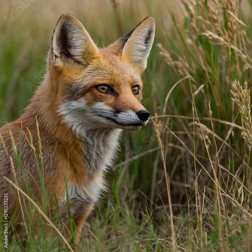 © Chamika, Fototapeta premium Predatory Grace: A Kit Fox Set to Leap from the Tall Grass
