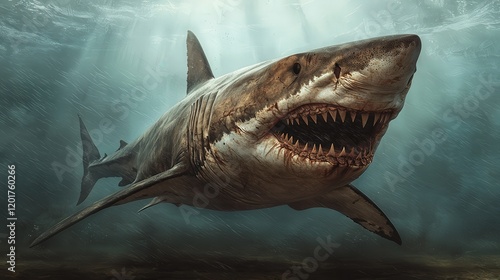 Naklejka premium Predatory shark encounter ocean depths wildlife photography underwater environment immersive viewpoint animal behavior