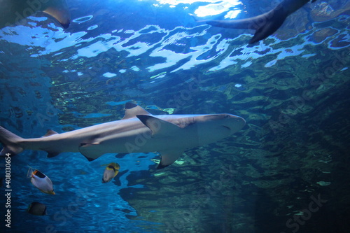 © Алла Мосурова, Fototapeta premium predatory tropical fish shark swims in the ocean water in the aquarium