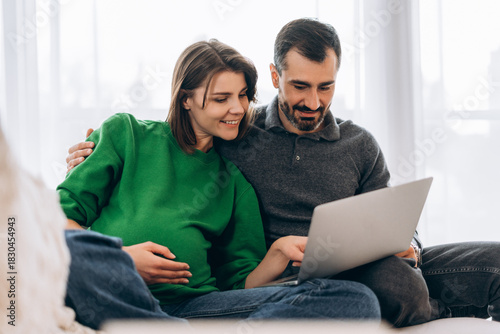 © Maria Vitkovska, Naklejka premium Pregnant couple shopping online for baby products