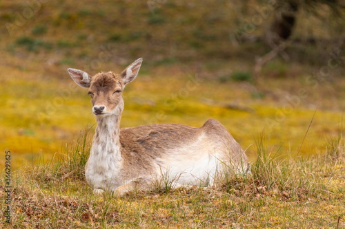 Fototapeta premium Pregnant fallow deer almost sleeping in the grass.